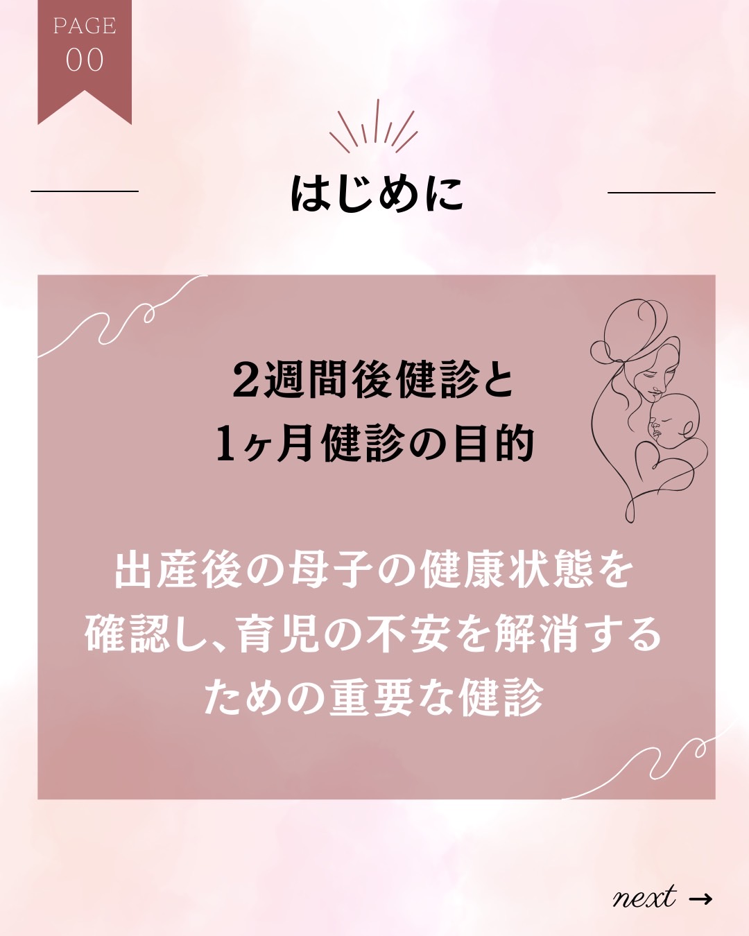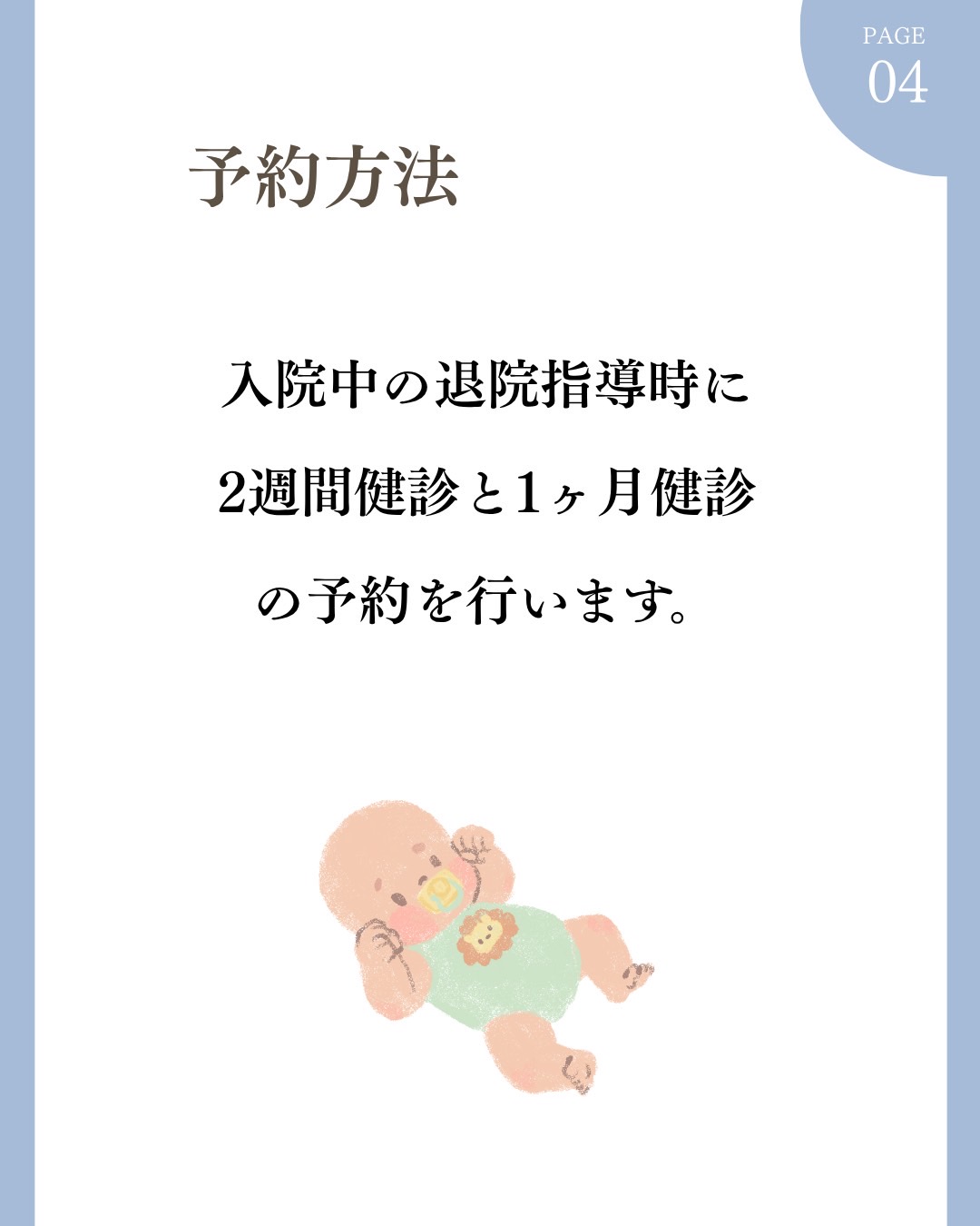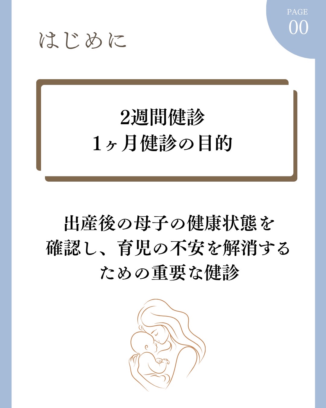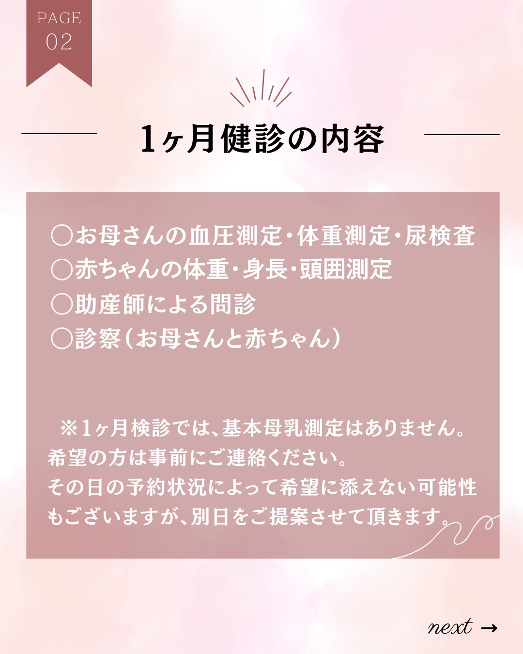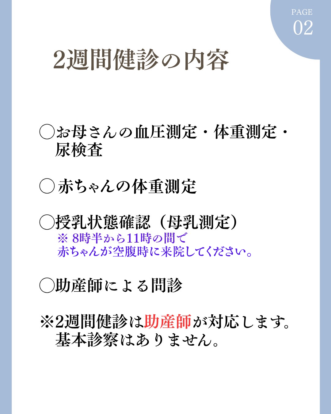 妊娠初期、中期(16~19週)、後期(35~36週)の保健指導を行い、1週間検診(産後2週間目)、1か月検診、母乳相談など、全力でサポートいたします。
