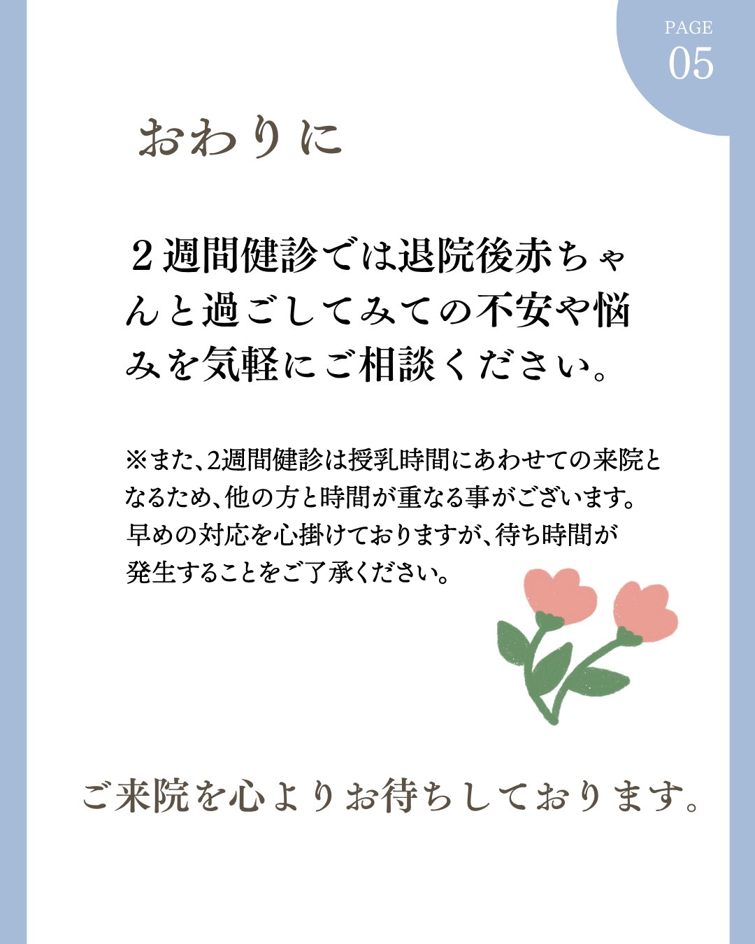 - 来院の際には、受付まで「母乳外来を受けたい」とお知らせ下さい。